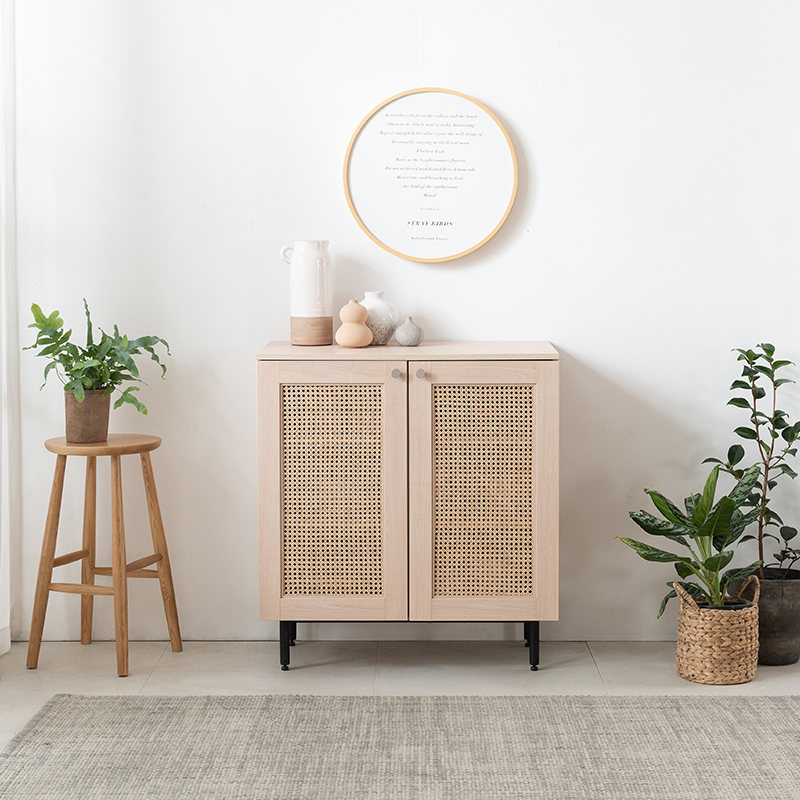 따뜻한 우드가 주는 고유의 내추럴 감성과 라탄케인 도어가 더해져 멋진 인테리어 가구로서의 비주얼을 자랑하는 라탄인테리어 소품 가구로 공간에서의 포인트 역할을 톡톡히 하고 있는 깔끔한 인테리어 가구 라탄케인 콘솔 수납장 디자인입니다.