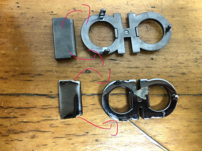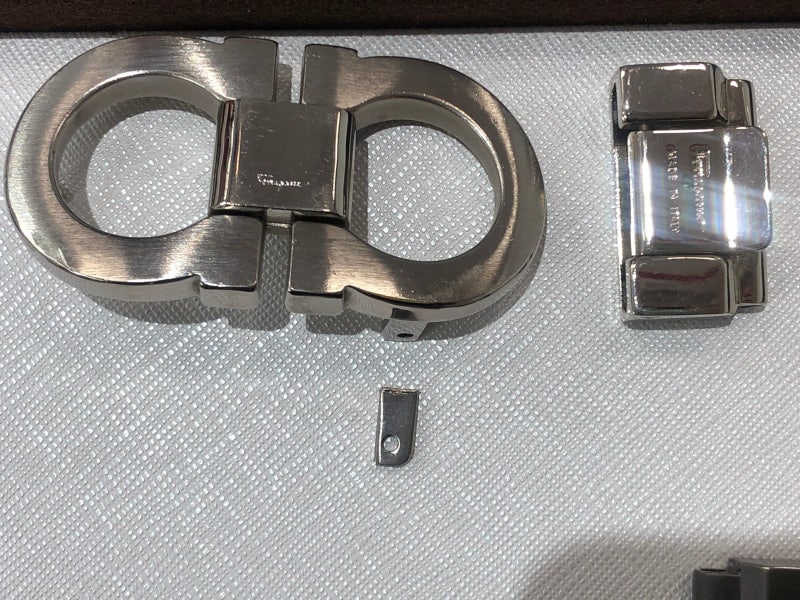 페라가모 버클 탈부착 페라가모 버클이 분리된 모습입니다 핀과 스프링이 허리에 힘을 이기지 못해 양쪽으로 지지대가 열려 현재 사용이 불가능한 상태이나 어려운 수리는 이쪽에서 가능합니다 지금까지 보신 페라가모 벨트 버클은 모두 예전보다 튼튼하게 수리 가능합니다 버클이 수리된 모습을 보세요
