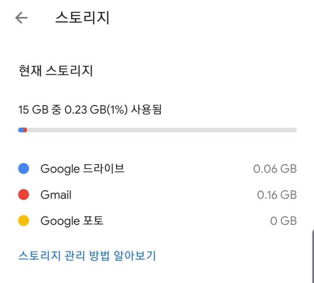 그럼 현재 계정에 관한 정보도 표시하고 설정에도 들어갈 수 있습니다.저의 구글 포토의 저장 용량이 꽉 찬 것과 빨간 색에서 나오는 것이 보입니다.여기서 추가하고 백업하려면 월 2,500원을 주고 추가 용량을 구입하거나 옵션의 상세를 클릭하고 Gmail와 드라이브 또는 Google포트를 정리하고 저장 공간을 확보하려고 나옵니다.하지만 위에서도 말했듯이 다른 앱을 쓰고 있기 때문에 추가로 지급할 생각은 없습니다.그리고 저장된 사진과 파일도 정리하지 못했으므로 그대로로 결정했습니다.더 이상의 백업은 진행하지 않은 채입니다.